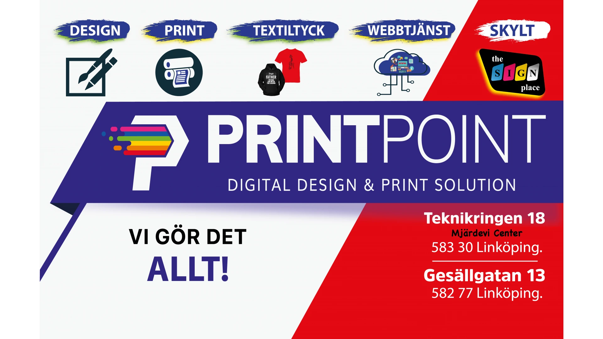 ”Vi valde PrintPoint för att deras styrkor är flexibilitet och tillförlitlighet. Vi uppskattar att PrintPoint tryckeri utöver skylten av våra affär, även tar hand om övriga beställningar och att vi kan lita på att det blir gjort. PrintPoint har även förmågan att ta fram nya idéer som passar för vår verksamhet.”