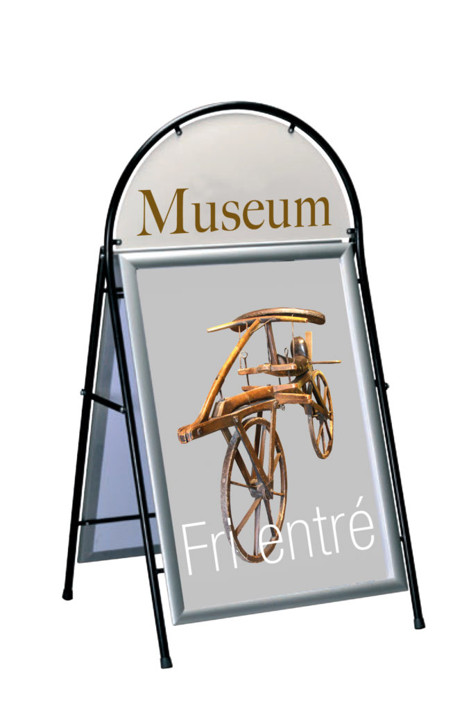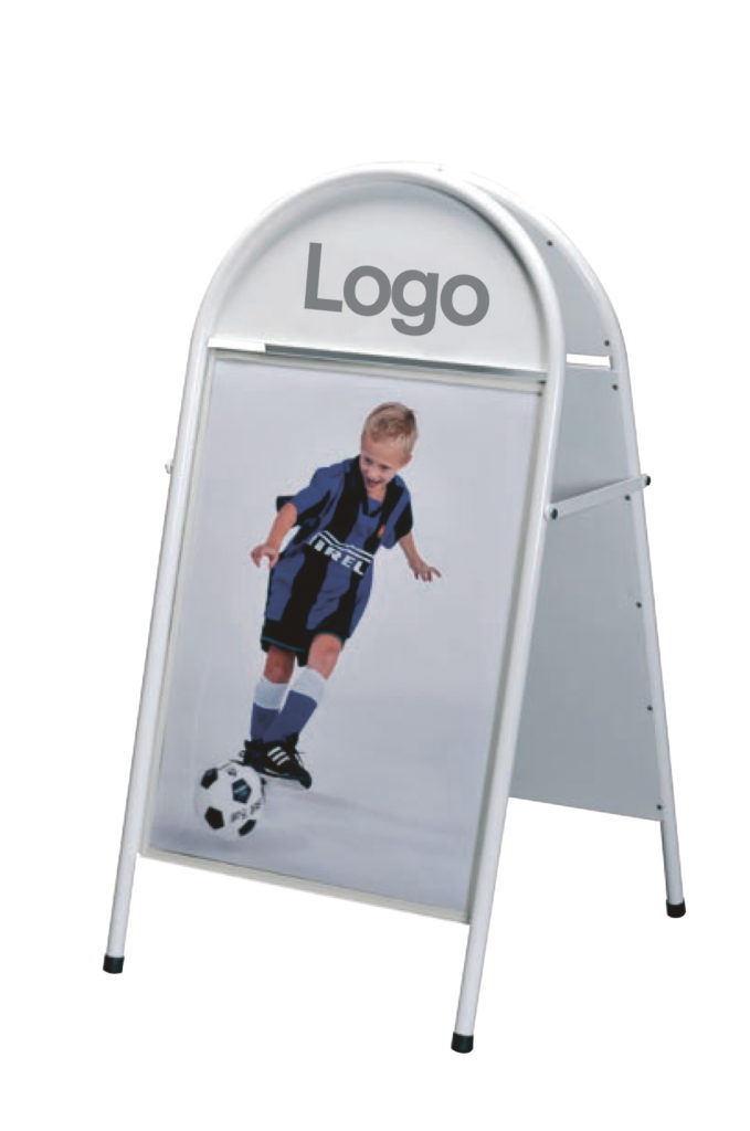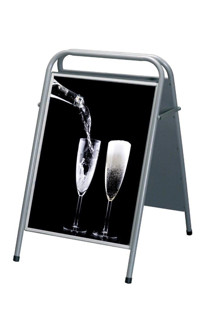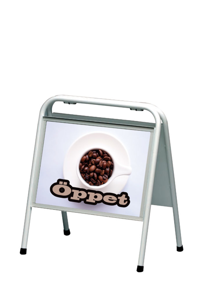 Ännu en nyhet som blivit mycket populär. Ett kraftfullt A-ställ med 4 mm griffellaminat i bästa kvalitet. Robust benstomme i 38 x 38 mm rör med 2 mm godstjocklek. Rörstommen är zinkfosfaterad innan pulverlackering för lång hållbarhet. Textskivorna är vändbara och lätta att byta. Plats finns upptill för logotype. Kan användas både inom- och utomhus. Textpennor finns att köpa, både som vattenfast och vattenlösliga.