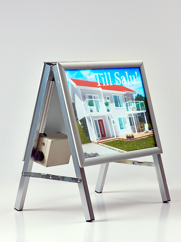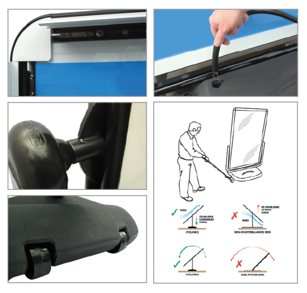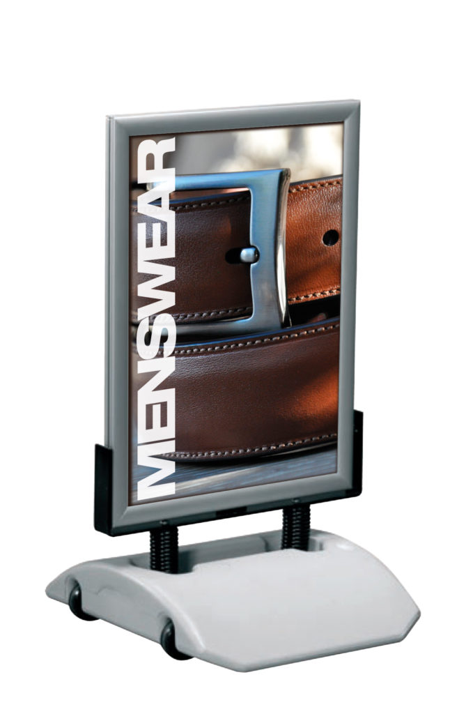 Mycket stabil konstruktion med kraftiga rostfria fjädrar som klarar alla väder. Basen är speciellt utformad för att kunna flytta hela stället lätt med en handtruck. Affischformat 1189 x1750 mm i dubbelsidigt utförande. Helt enkelt den bästa stora gatuprataren på markanden. Enkla byten av innehåll med snäppramstekniken. Storm och vattensäker.