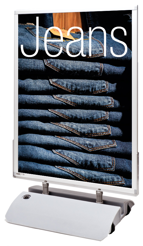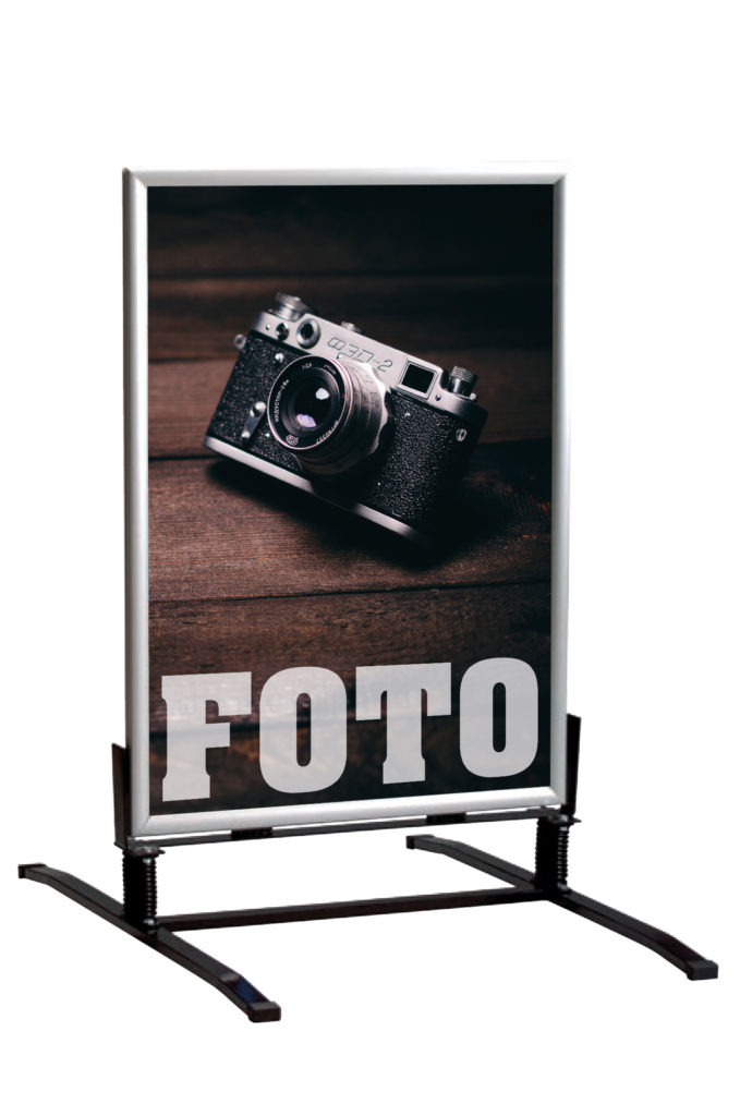 Ett rejält skyltställ i 100 x 140 format. Plastfot som man fyller med sand eller vatten. Inbyggda hjul i foten vilket gör att skylten lätt går att flytta eller ta in på natten. Marknadens bästa fjäderställ i storformat. Tillverkat i Europa.